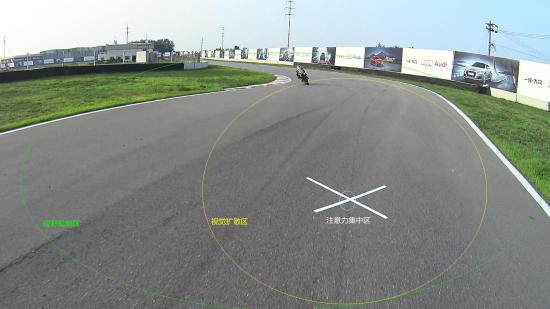 用眼睛的注意力集中区关注于行进路线,用视觉扩散区关注整条赛道(道路)上,用视野轮廓区关注赛道(道路)以外的可见区域。