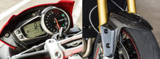 2016款凯旋Speed Triple R和Speed Triple S共104项变动。全新的曲轴、缸头、活塞,燃烧室构型全新设计以加大燃烧效率,新配置了电子油门系统、滑动式离合器以及Brembo卡钳。全新设计的水箱散热器比老款体积有所减低但是通过对循环通道的调整增加了散热效率。排气系统也针对发动机做功效率进行了相应,排气总流量增加70%。有恶魔红和魔幻黑双色可供选择。