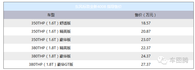 2016年11月16日晚,东风标致全新4008正式上市,新车共推出搭载1.6T(350THP)和1.8T(380THP)两种动力系统的6款车型,售价区间为18.57-27.37万元。全新4008采用了标致最新的家族式设计语言,前脸采用了标致最新的点阵式进气格栅设计,配合全新狮眼大灯组,看上去个性十足。此外,全新前保险杠造型让新车前脸看上去更加具有层次感。