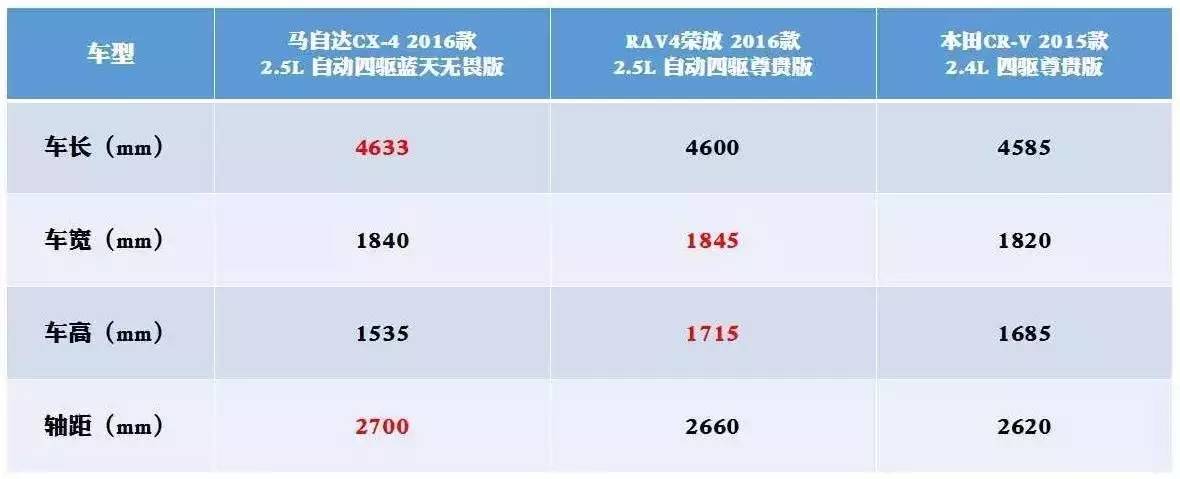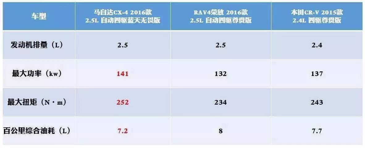 相比来说,本田CR-V在动力表现上要优于丰田RAV4,其2.4L的自然吸气式发动机最大功率和最大扭矩都超过了RAV4,但比起CX-4仍小了很多,另外其排量虽然小于CX-4,但综合油耗却高出近0.5L。