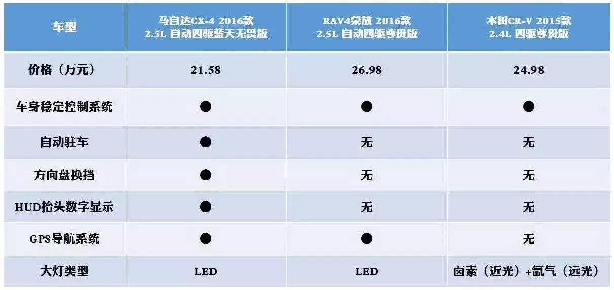 从上述表现看, CX-4都超过了其他两款产品,而在最有说服力的性价比方面,更是让其他两款产品难以招架。在科技配置上, CX-4配置了LED前大灯灯组、空调温度分区控制以及车内空气调节/花粉过滤等功能,这些CRV均没有搭载。