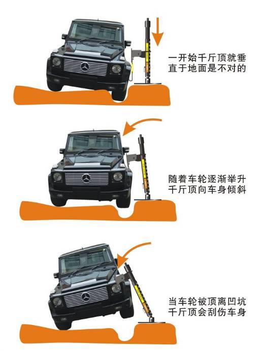 考虑到车载千斤顶属于承重部件,所以要注意千斤顶与地面之间的支撑情况,尤其是在松软的土质上操作,重压之下容易发生一定的塌陷下沉,对此可以在车载千斤顶底座垫一块较大的硬板或者石块来分散应力。同时要注意千斤顶与车辆保持90°的直角,一旦因底座不平、或者车辆溜车造成的侧倾,千斤顶支撑力下降,坍塌事故往往由此发生。