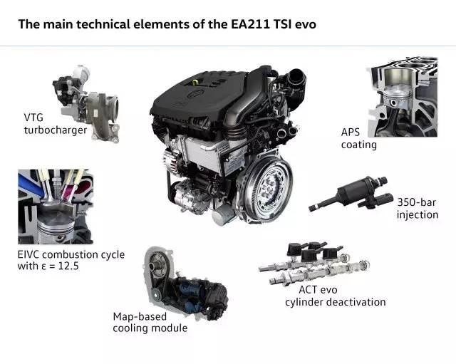 这款在2016年发布的EA211 1.5L TSI Evo发动机将彻底代替当前的1.4T机型,可变几何截面涡轮、喷射压力达350bar的燃油喷嘴以及能提高燃油经济性的米勒循环等多重新技术的加持主要体现在发动机热效率和燃油经济性的提升。其压缩比高达哦12.5:1,热效率提升至37.5%。而动力水平为最大功率为150马力/4750-5750转峰值扭矩为200牛.米/1300-4500转,与现款EA211 1.4T机型保持同一水平。
