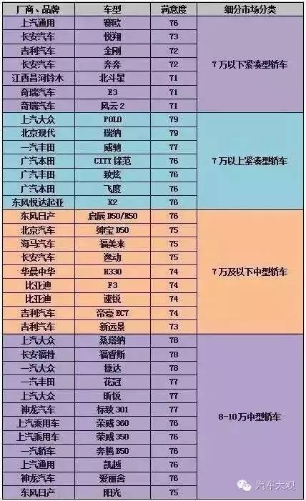 以价格、发动机排量和轴距综合划分细分市场车型,各细分市场CACSI(汽车综合满意度指数)第一(含并列第一)的车型是: