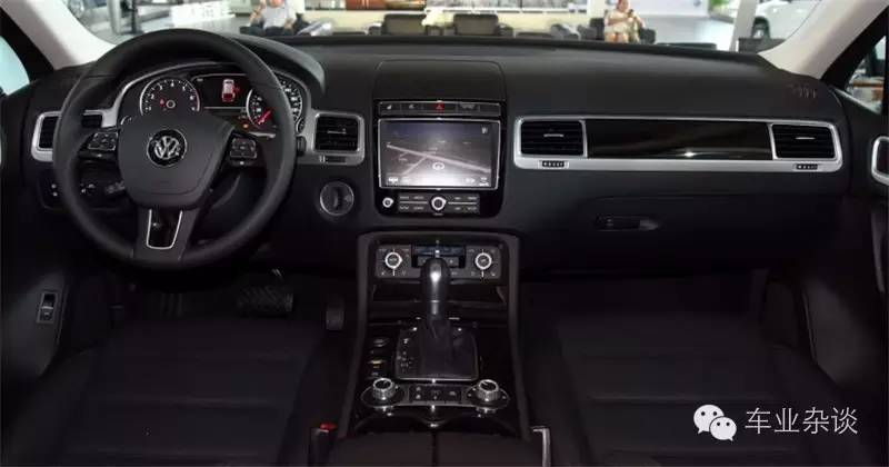 途锐全黑的内饰设计,搭配银色饰条,整体风格较为稳重中庸。中控台大部分采用了搪塑包裹、钢琴烤漆以及木纹饰板覆盖,营造出较浓的行政商务感。