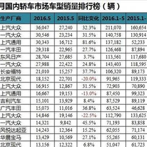 轿车市场5月销量有所回暖,整体实现了小幅度的增长,同比上扬0.7%至92.3万辆。其中大众品牌轿车优势依然较为明显,前十车型中占据了4个席位。