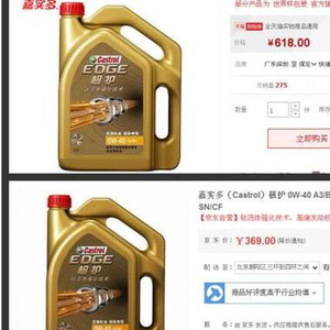 随后,小编就开始在网上寻找适合自己车型的机油,选定了嘉实多极护0W-40全合成机油,可是在购买的时候出现了问题,同一款机油,在我们最信赖的两家网购店,出现了不同的价格,而且相差很大!什么原因呢?
