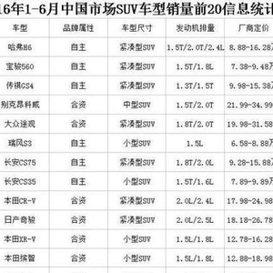 2016年1-6月中国市场SUV车型销量前20信息统计表