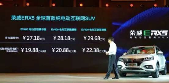 6月3日,上汽集团创新战略最新成果——“全球首款纯电动互联网SUV”荣威ERX5在深圳上市。新车共三款车型,官方指导价为27.18万-29.68万元,扣除补贴后售价为19.88万-22.38万元。