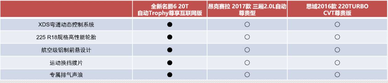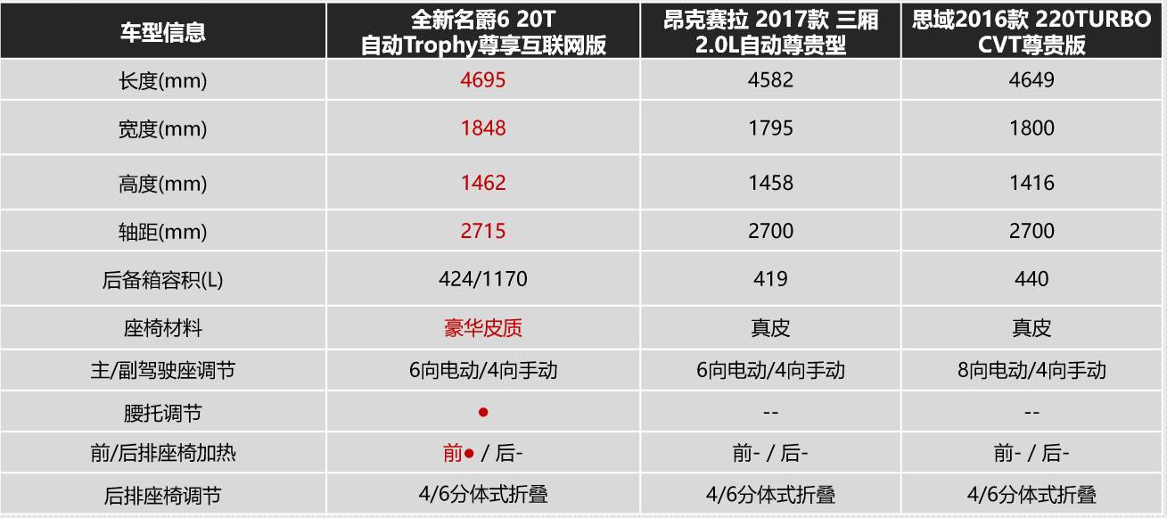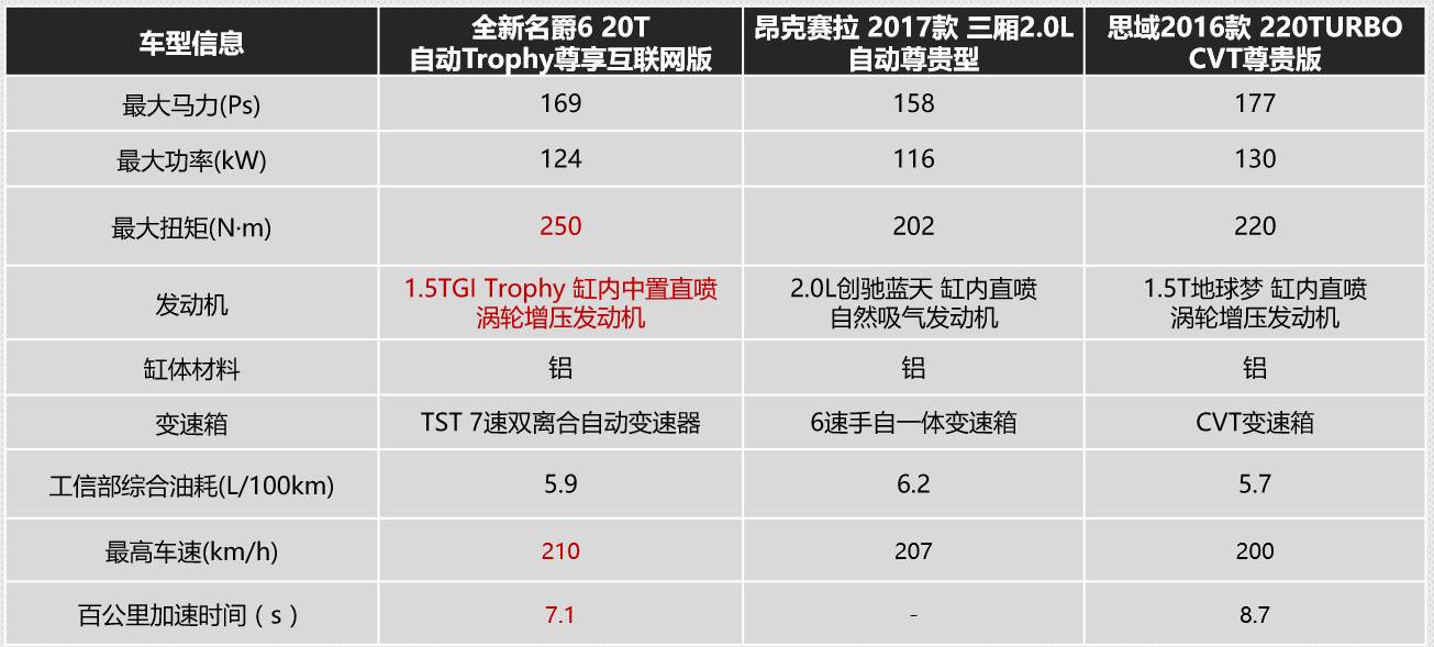 显然,全新名爵6能否在这一市场中立足,直接关系到上汽“越级对标”的成败。我们可以拿出全新名爵6 20T自动Trophy尊享互联网版和昂克赛拉 2017款2.0L自动尊贵型(三厢)、思域2016款220TURBO CVT尊贵版进行对比,看看名爵6能否对这两款车型造成冲击。