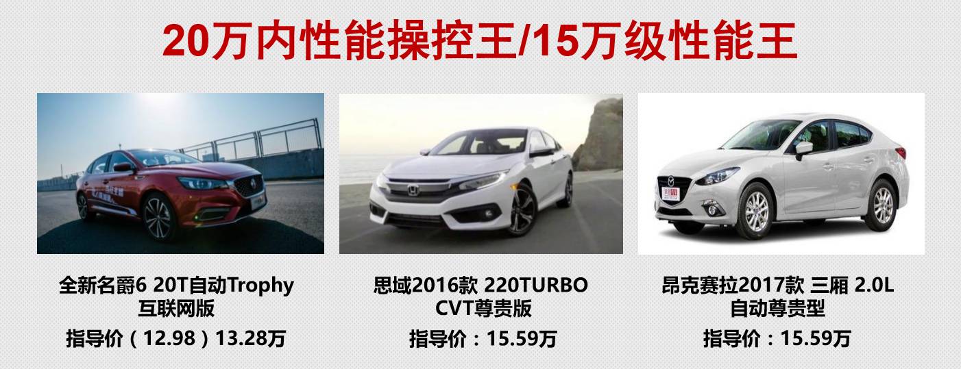 定位运动型轿车的全新名爵6,上市之初就把本田思域和马自达昂克赛拉等运动车型作为竞争对手。目前,这两款车在市场上都能达到月销过万的水平。本田思域更一度因加价等候,获得了“神车”称号。