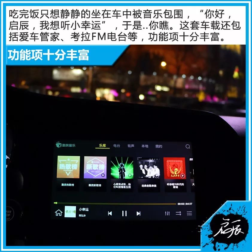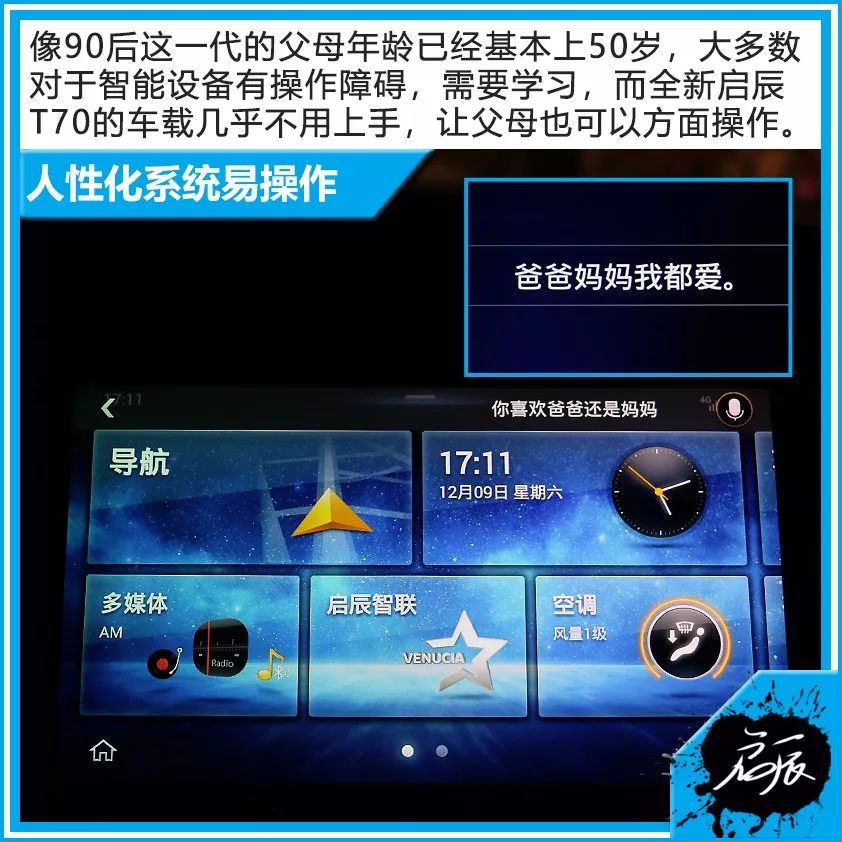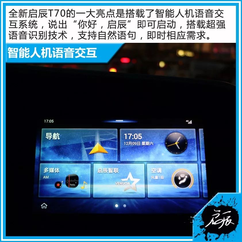 全新启辰T70配备的10.1英寸高清多点触控屏显示画质和触控灵敏度都表现不错。车载配置了智能人机语音交互系统,超强语音识别技术源于科大讯飞,支持自然语句,即时响应需求。行驶过程中通过“你好,启辰”即可启动该语音系统,诸如温度调节、想去的地点、天气、音乐等均可通过与车机交互完成,使用起来十分便捷。