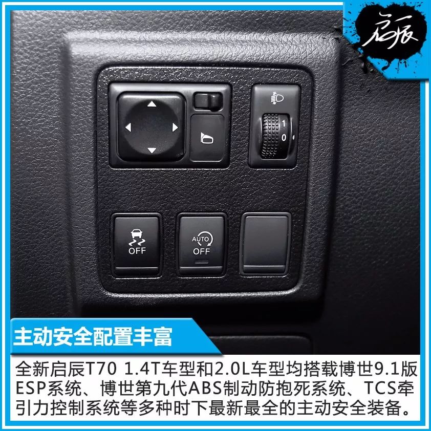 全新启辰T70主动安全配置也是其提升品质和用户体验的亮点之一。1.4T车型和2.0L车型均搭载了博世9.1版ESP(VDC)系统、博世第九代ABS制动防抱死系统、TCS牵引力控制系统、HSA上坡起步辅助系统、ATC主动循迹控制系统、TPMS胎压监测系统等多种时下最新最全的主动安全装备。