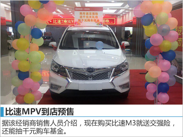 比速汽车是北汽银翔最新成立的乘用车品牌,定位略高于北汽幻速,其首款车型已接近上市。网上车市从比速汽车经销商处了解到,紧凑型7座MPV比速M3现已到店,并可接受预定,新车的预售价格区间为6-8万元。据销售人员透露,比速M3最快将于本月底正式开售。