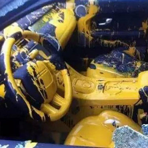 这辆路虎揽胜的怀疑乱停车遭到报复。他的车窗被人打破了,而且车身和车子里面都被泼上了油漆,高贵的路虎瞬间变得面目全非。透过破烂的玻璃我们可以看到车窗里面的情况,车子的驾驶室中被黄色的油漆泼得到处都是。让原本的豪车瞬间变成了一辆废车。