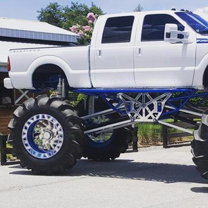 这辆F250走的是Hight-Lift改装风格,主要是展示皮卡的霸气和机械感的一面,而不是和越野车一样以增加通过性为目的。所以车主直接放弃原厂车架悬挂,单独定制已经升高改装的车架,而前后悬挂均采用着“4-Link”的螺旋弹簧加避震器的结构组合。