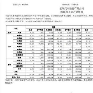 6月7日,长城汽车正式公布最新产销情况: 5月份,长城汽车销售71636辆,较去年同期增长9.54%。其中,SUV销售61793辆,同比增长12.82%,皮卡销售8123辆,同比增长6.11%,轿车销售1720辆。