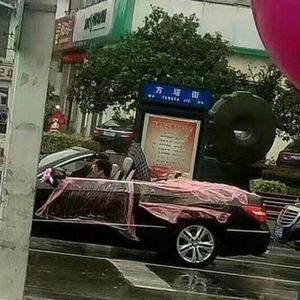 雨伞和敞篷车根本就不配,天上下着毛毛细雨,开敞篷车帮朋友接亲,朋友说结婚吗,图个喜庆,图个热闹,发点喜糖,发点塑料纸(天有不测风云)速度上到40,雨伞果然不靠谱,还是塑料纸靠谱,经验之谈!