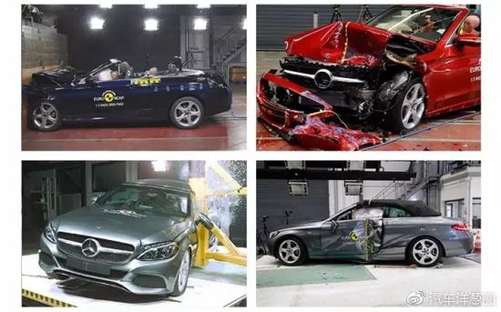 通过下图可以看出,敞篷版C级在正面碰撞、侧面碰撞以及鞭打测试中都能保持车身整体形态的正常,没有发生过大的变形。