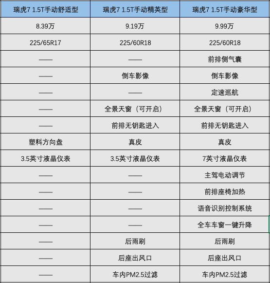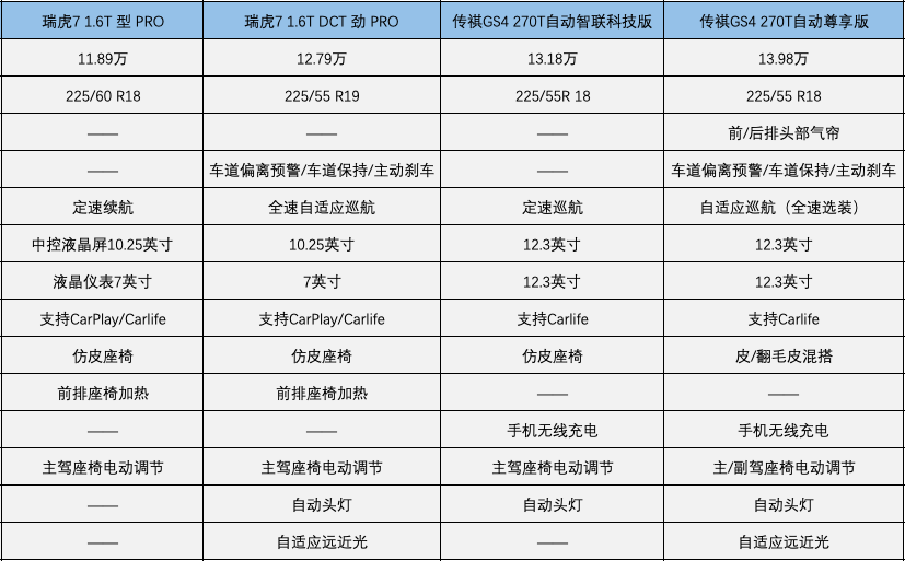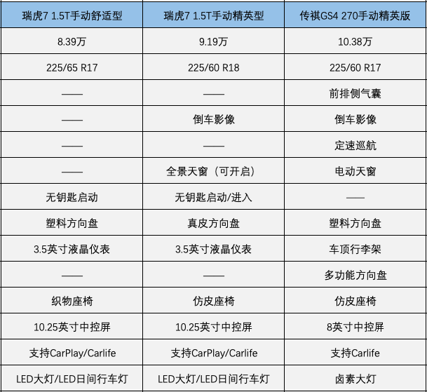 优先推荐自动智联科技版(13.18万),它只比自动豪华智联版(12.68万)贵了5000元,却多出了18寸轮毂、360度全景影像、真皮方向盘、无线充电、主驾电动调节、自动头灯、后视镜电动折叠、后视镜电动加热、隐私玻璃、车载空气净化器、自动头灯、LED雾灯。所以妥妥地pass掉自动豪华智联版(12.68万)。配置更高一级的自动尊享版(13.98万)性价比也非常高,比自动智联科技版(13.18万)贵了8000元,配置上却多出了前后侧气帘、车道偏离预警、车道保持、主动刹车、自适应续航等全套主动安全配置,多出自适应远近光大灯,以及皮质/翻毛混搭的座椅材质,手感超级棒。四、对比,选瑞虎7还是传祺GS4?1.假如你买手动挡: 我们在刚才筛选出来的奇瑞瑞虎7 1.5T手动舒适型(8.39万)、瑞虎7 1.5T手动精英型(9.19万)、传祺GS4 270手动精英型(10.38万)之间进行对比。