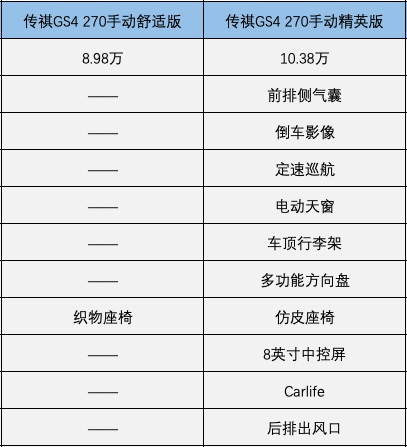 3.传祺GS4手动车型方面,共包含3款,入门车型手动舒适版(8.98万)配置太低,不推荐;中配手动精英型(10.38万)贵了1.4万元,多出了前排侧气囊、倒车影像、定速巡航、电动天窗、仿皮座椅、8英寸中控屏。无论是安全配置,舒适配置,还是科技配置都有质的提升,所以我认为这1.4万花得值。