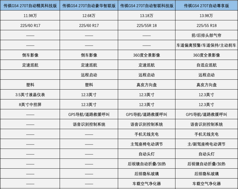 4.传祺GS4自动挡车型方面,共包含6款,跟之前的逻辑一样,先pass掉入门车型自动舒适版(11.38万)和顶配自动至尊版(15.18万),在剩下的4款车型里挑。