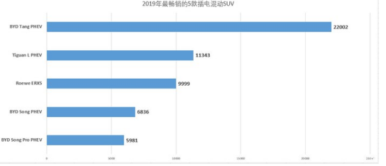 再来看看插电式混合动力SUV车型的销量表现。这个细分市场的前五名分别是比亚迪唐DM,大众途观L插混版,荣威eRX5插混版,比亚迪宋插混版以及比亚迪宋Pro 插混版。可以看出,比亚迪汽车还是很有优势的。