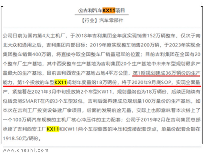 吉利品牌目前已经导入了CMA中级车基础模块架构(领克全系、沃尔沃XC40等车型均出自该架构),推出了首款车型——星越。网上车市了解到,吉利将推出CMA架构下的第二款车型,内部代号为“KX11”。新车定位于中型SUV,主推大五座。这款车将会在今年9月在吉利西安生产基地投产,预计年内就能投放市场。(文章中车图均为豪越)