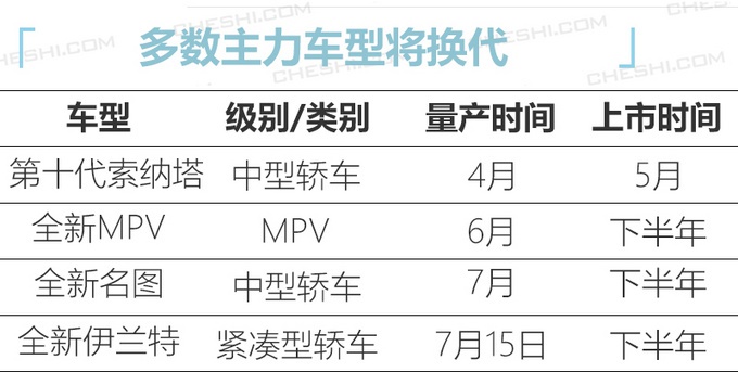 网上车市通过梳理后发现,北京现代在2020年至少有第十代索纳塔、全新MPV、全新名图以及全新伊兰特 (配置|询价)4款新车即将上市。根据内部PPT能看到,这些新车会在二、三季度集中量产,其第十代索纳塔会率先在4月投产,5月上市。(注:规划为今年初制定,各车型量产可能会延后)