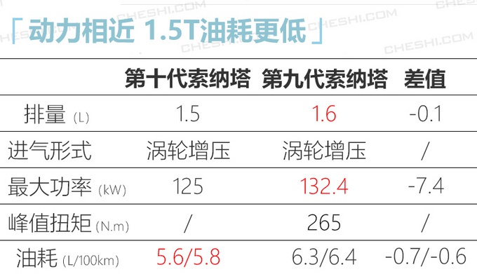 除了外观变化较多外,第十代索纳塔相比现款除了高度外,其余参数全面提升,并且在车长、轴距等方面还优于一汽-大众迈腾、本田雅阁 (配置|询价)等一众竞品。动力上,新车搭载1.5T和2.0T发动机,前者最大功率较现款1.6T有所降低,而2.0T车型动力基本没有变化。传动系统上,1.5T车型匹配7DCT,而2.0T车型采用8AT。新1.5T+7DCT的动力组合主要在油耗上有所下降,每百公里综合油耗在5.6-5.8L之间。