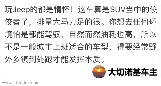 一位大切诺基这样评价这款车型:“玩Jeep的都是情怀!这车算是SUV当中的佼佼者了,排量大马力足的很。你想去任何环境怕是都能驾驭,自然而然油耗也高,所以不是一般城市上班适合的车型,得要经常野外乡镇到处跑才能发挥本质。”