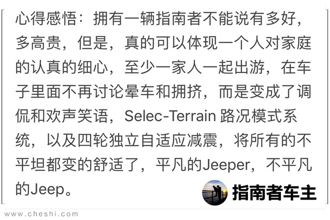 “拥有一辆指南者不能说有多好,多高贵,但是,真的可以体现一个人对家庭的认真的细心,至少一家人一起出游,在车子里面不再讨论晕车和拥挤,而是变成了调侃和欢声笑语,Selec-Terrain 路况模式系统,以及四轮独立自适应减震,将所有的不平坦都变的舒适了。”一位指南者车主说道。
