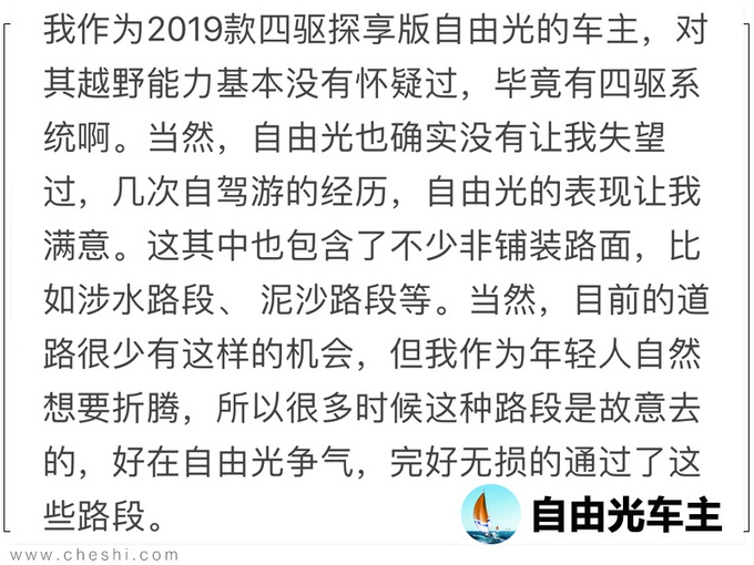 三款车型都更加偏向于城市SUV,但也都提供有四驱车型,可以应对简单的非铺装路况,毕竟越野性能是Jeep品牌的精髓所在。自由光也是广汽菲克推出的首款车型,兼顾城市用车与越野性能,中高配车型均配备了四驱系统,20-30万元的售价吸引了众多有着一颗越野心的消费者。自由光车主说道:“对其越野能力基本没有怀疑过,自由光也确实没有让我失望过,几次自驾游的经历,自由光的表现让我满意。这其中包含了不少非铺装路面,比如涉水路段、泥沙路段等。”