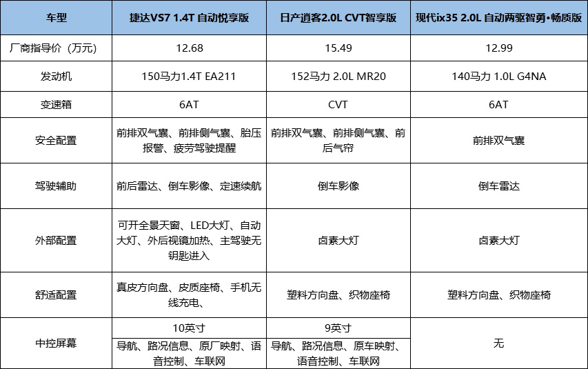 日产逍客起售价就达到了15.49万元,本着价格尽量接近的原则,捷达VS7变为中配的悦享版依旧对比逍客智享版。要说捷达VS7的入门版对比逍客入门版还是伯仲之间的话,到了捷达VS7悦享版对比逍客智享版时,捷达VS7的优势就突显了出来,中控屏幕的车联网也有了,还多了自动LED灯等配置,何况1.4T悦享版售价只有12.68万元,还是比日产逍客智享版(15.49万元)性价比高;现代ix35 2.0L自动两驱智勇·畅质版比捷达VS7贵且配置不足。