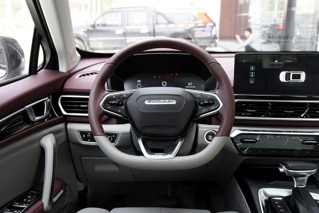 平底式方向盘采用了双色设计,并且在手部经常接触的位置采用了打孔真皮包裹,质感出色,正中央为"BAOJUN"字母样式Logo。