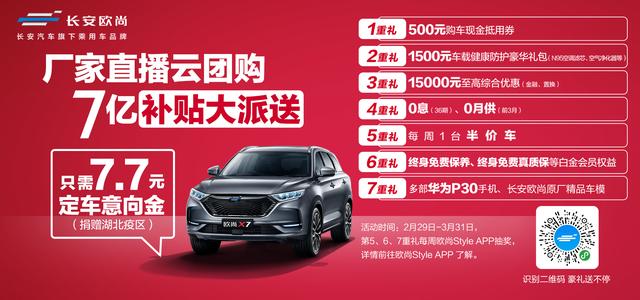 考虑到有购车计划的消费者在疫情期间不变出门的情况,长安欧尚推出了线上线下的安全通道。而对于疫情期间需要购车的消费者,长安欧尚还推出了“厂家直播云团购,7亿补贴大派送”活动,消费者只需在直播中通过欧尚Style H5页面向疫区公益捐款7.7元,即可获取即500元购车现金抵用券、1500元车载健康防护豪华礼包、15000元至高综合优惠,更有机会享受半价购车、双保双免、华为P30手机等购车福利。让消费者无论是买车,还是用车,都能感受长安欧尚给予的关怀。