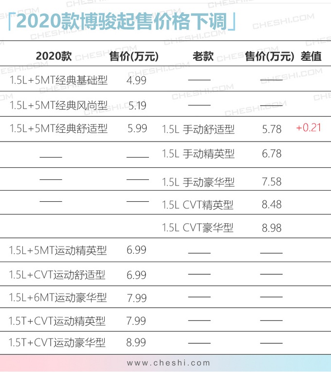 车型名称售价(万元)1.5L+5MT 经典基础型4.991.5L+5MT 经典风尚型5.191.5L+5MT 经典舒适型5.991.5L+5MT 运动精英型6.991.5L+CVT 运动舒适型6.991.5L+6MT 运动豪华型7.991.5T+CVT 运动精英型7.991.5T+CVT 运动豪华型8.99制表:网上车市 www.cheshi.com
