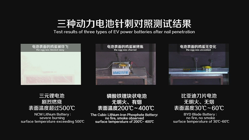 从实验结果来看,刀片电池在针刺实验中表现出极高的安全性,拥有极强的抗热失控和抗热扩散性能。中国科学院院士 清华大学教授欧阳明高解释:“因为刀片电池采用的是长条形设计,钢针穿透的电极板数量较少,所以触发电池内部短路的的数量相对较少,这也就导致产生的热量也更少。与此同时,加上电池的壳体又还有着较强的散热性能,所以有着较高的安全系数。