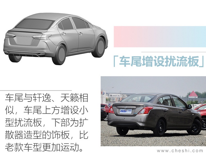 车顶从C柱位置向下延伸的弧线,搭配车窗装饰件营造出“半悬浮”的视觉效果,新车相比老款车型的与车尾衔接更加顺畅。车尾整体设计较为简洁,尾灯的造型与轩逸、天籁十分相似,同时车尾上方增设小型扰流板,下包围还带有扩散器造型的饰板,相比老款车型运动了许多。