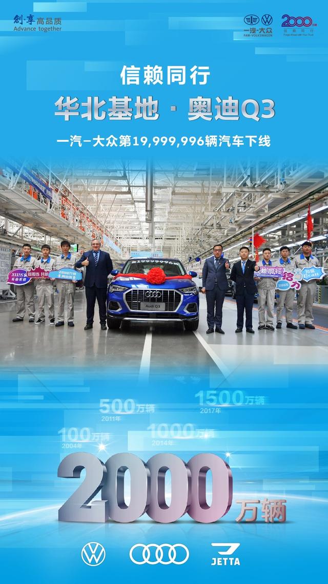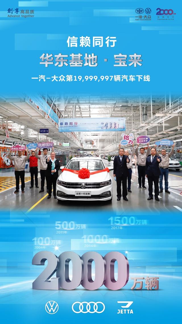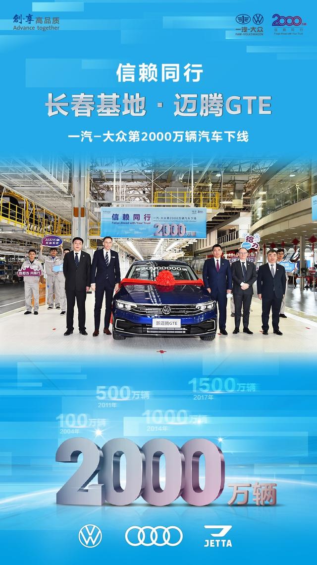 一汽-大众表示,2000 万辆汽车下线是一汽-大众企业发展史上的里程碑,也是走向未来的新起点。这份成绩的背后,得益于各级政府长期以来的高度关注和支持,得益于双方股东的精诚合作和扶持,更得益于近2000万车主的认可与信赖。