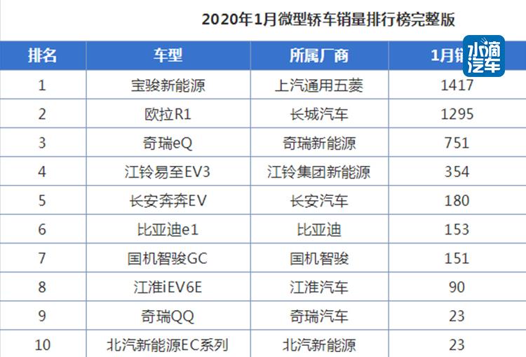 2019年全年微型车销量排行榜前十已经找不到传统燃油车型的身影。今年1月宝骏微型新能源车销量1217辆;欧拉R1销量1295辆,成为微型轿车排行榜上仅有的两款月销量过千的车型,更多的销量还是处在三位数的状态,更有甚者销量仅有两位数,形势不容乐观。