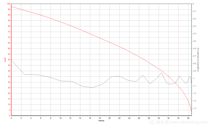 至于刹车,四条235胎宽的轮胎带来了很好的抓地力,只要刹车系统保持有足够制动力,成绩一般是不需要担心的,而实际情况也是如此。在刹车过程中整车的姿态还是控制得不错的,本身车身重心也不高,悬挂支撑力也够,所以点头现象比较轻微。刹车踏板初段就已经有不错的制动力,全力刹车的时候回馈也不错,最终取得了39.26米的百公里刹车成绩,属于优秀的范畴。