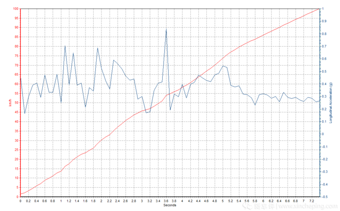 这台EA8882.0T高功发动机最大功率162kW,最大扭矩350N·m,而车重只有不到1.6吨,看到几个数据就就知道加速成绩不会差了。在整个加速过程中可以感觉到发动机的动力储备很足,到后段加速的时候时速表依然以比较快的速度上升,在上方的速度G值时间表也可以看到速度达到100km/h的时候G值也有接近0.3g,最终百公里加速测试成绩为7.39秒。