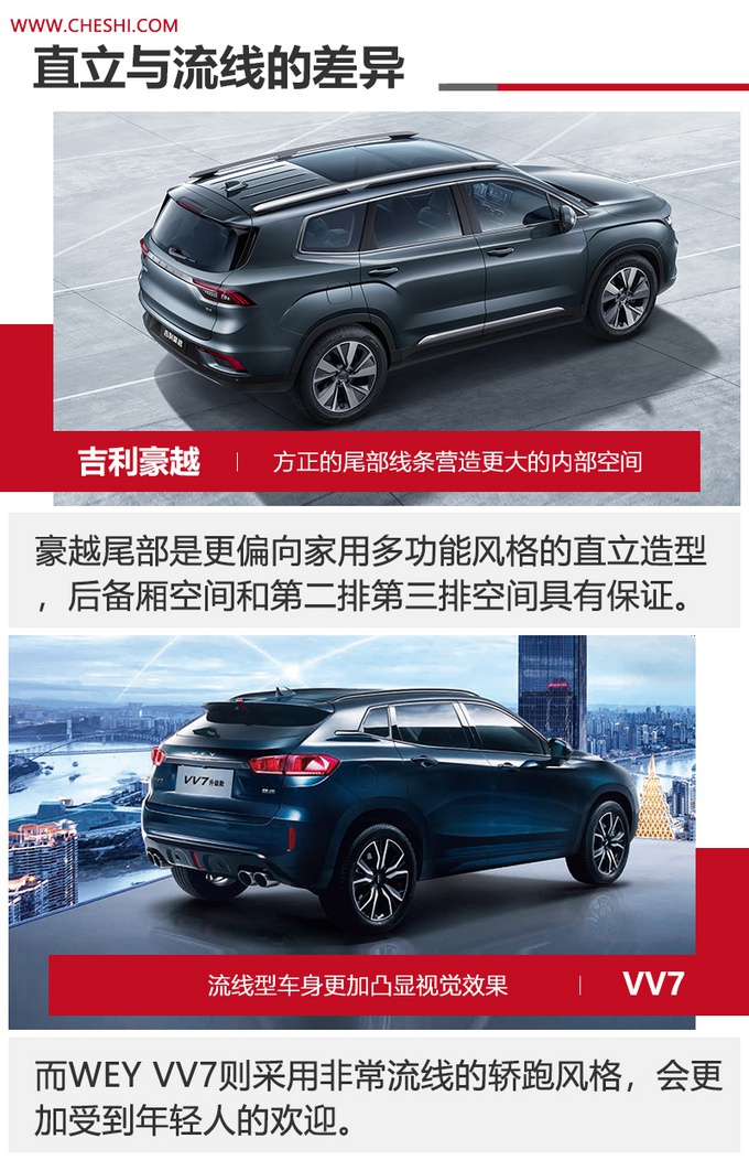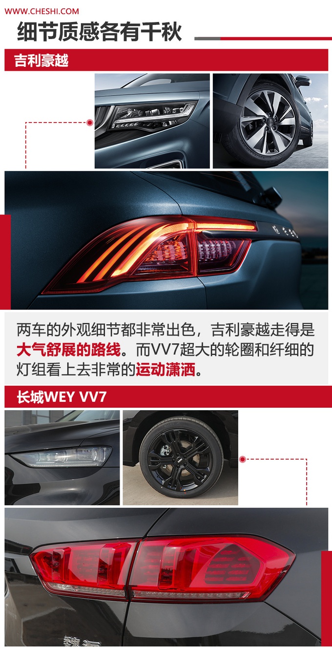 外观设计是一项见仁见智的产品力点,首先来说说已经上市多时的VV7。作为长城WEY这个新兴品牌的首款车型,VV7垫定了家族式设计语言的基础。作为一款完全独立自主研发出品的车型,VV7的外观一经上市就受到了广大消费者的好评。超大的轮圈、流线型的轿跑车身、极富运动感的四出式排气都是它引人瞩目的元素。而吉利豪越同样也有强大的家族基因,水波涟漪式的中网造型搭配修长的车身比例,表达的是和VV7不一样的实用主义。两者没有是否好看的差异,毕竟二台车型定位的人群和市场不完全一致。
