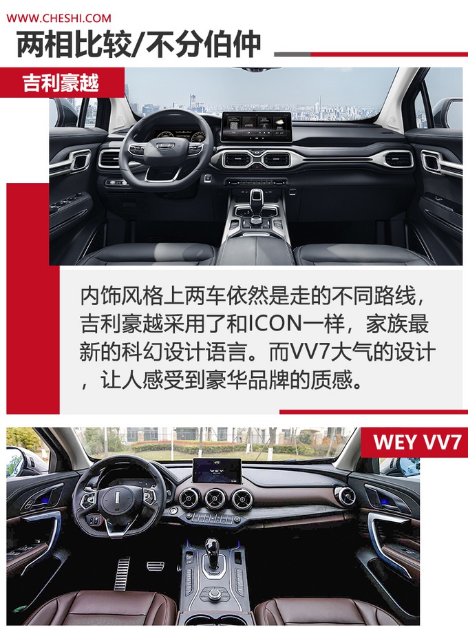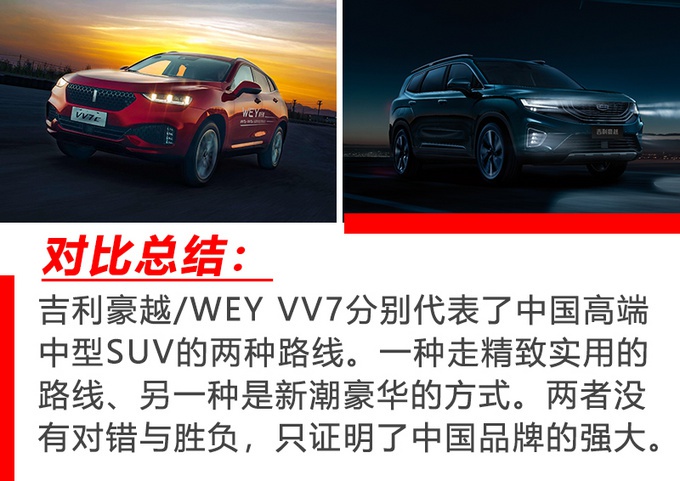 经过简单对比后,我认为吉利豪越和WEY VV7之间并没有谁胜谁负的局面。走精致实用路线的吉利豪越,在外观内饰设计和空间体验上都做得非常出色,标准的中型SUV的车身尺寸结合未来不会太高的售价,家庭使用买它!买它!而WEY VV7的出现象征着中国汽车品牌进入了一个新的阶段,不再是简单的堆砌配置,追求个大量足、而是通过设计,实现真正的豪华与精致感,也从侧面反应了我们现在的中国品牌已经真正的强大起来了。