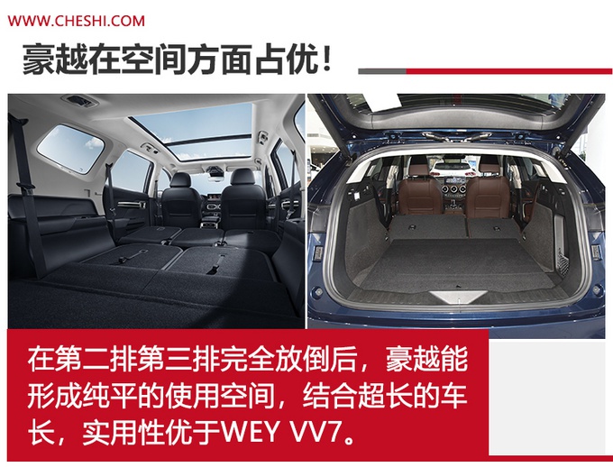 但从空间尺寸的体验上来看,由于设计了第三排座位,同时拥有更长的车身尺寸,吉利豪越的内部空间体验要明显好于VV7。WEY VV7的溜背造型和较短的车身长度,在整体空间上肯定是要略逊一筹,不过凭借接近3米的轴距数据满足日常家庭使用是没有问题的。