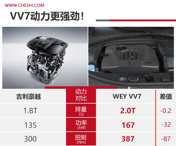 从目前披露的信息来看,吉利豪越未来将搭配1.5T和1.8T两款发动机,分别搭载6速手自一体变速箱和7速双离合变速箱,相比于WEY VV7全系2.0T的配置相对比较弱势。对于一款中型SUV来说,市面上的大多数车型都是2.0T的动力配备,不过好在吉利豪越的发动机性能属于同排量中比较强大的一类,达到了很多豪华品牌2.0T低功率发动机的水平,应付时常的使用没有问题,如果想更激烈驾驶的用户也不会考虑此类车型。