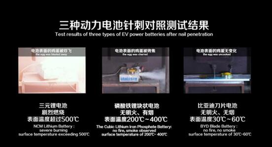 比亚迪将三元锂电池、传统磷酸铁铝电池及“刀片电池”放在同样的测试条件下,做了“针刺穿透测试”,其中三元锂电池在被针刺瞬间,表面温度达到500度,并发生剧烈燃烧,把电池表面的鸡蛋炸飞;传统块状磷酸铁锂电池在被刺穿后,表面温度达到200-400度,无明火,有烟,电池表面的鸡蛋被高温烤糊;“刀片电池”在被穿透后,电池表面温度仅30-60度,无明火,无烟,电池表面的鸡蛋完好无损。这一结果足以证明“刀片电池”的安全性无人能敌。