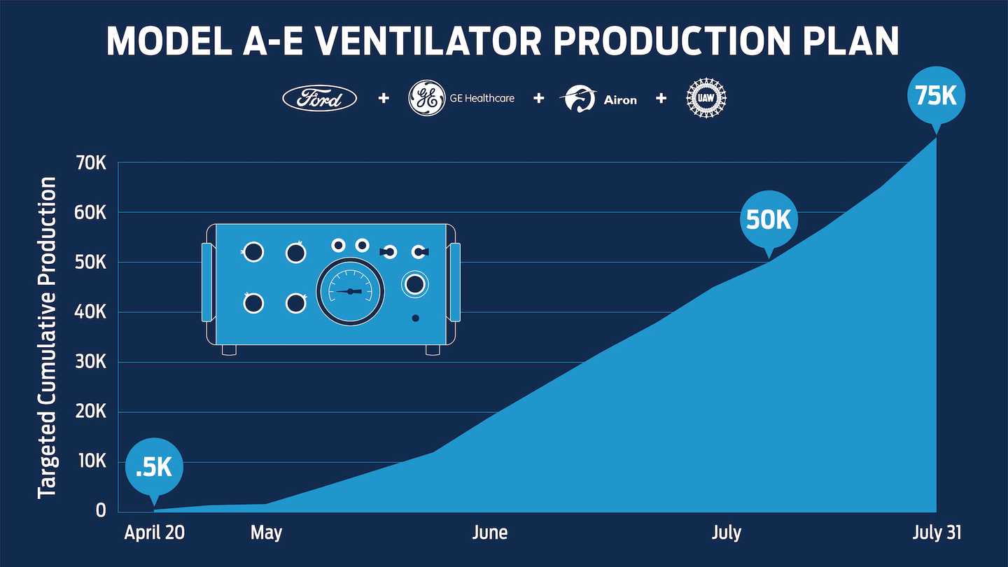 这款呼吸机的设计来自于Airon Corp,这是一家专门从事高科技气动生命支持产品的公司,凭借着福特在制造业方面的能力和通用电气公司的临床专业知识,他们预计将在未来一段时间内大批量的生产呼吸机。预计目标数量将在100天后完成。福特计划在4月底之前生产1,500台呼吸机,在5月底之前生产12,000台呼吸机,并在7月4日之前生产50,000台呼吸机。