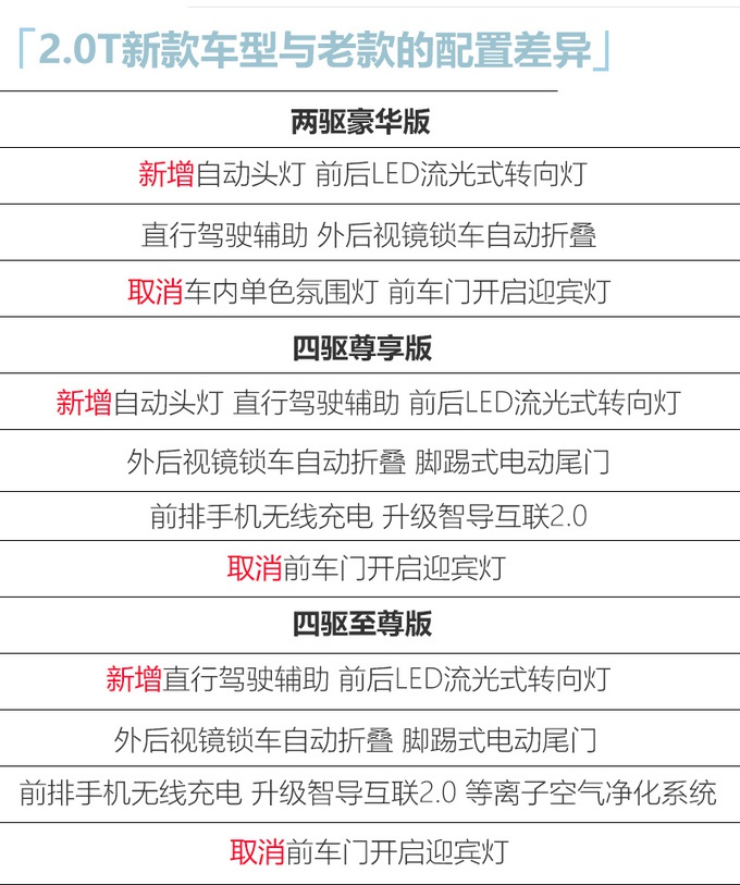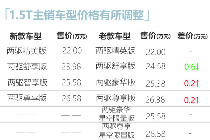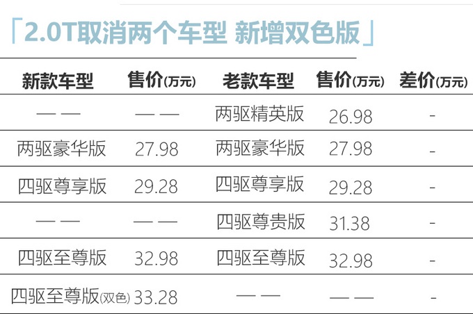 车型名称售价(万元)240TURBO CVT两驱精英版22.00240TURBO CVT两驱舒享版23.98240TURBO CVT两驱智享版25.58240TURBO CVT两驱尊享版26.58370TURBO 9AT两驱豪华版27.98370TURBO 9AT四驱尊享版29.28370TURBO 9AT四驱至尊版32.98370TURBO 9AT四驱双色至尊版33.28制表:网上车市 www.cheshi.com